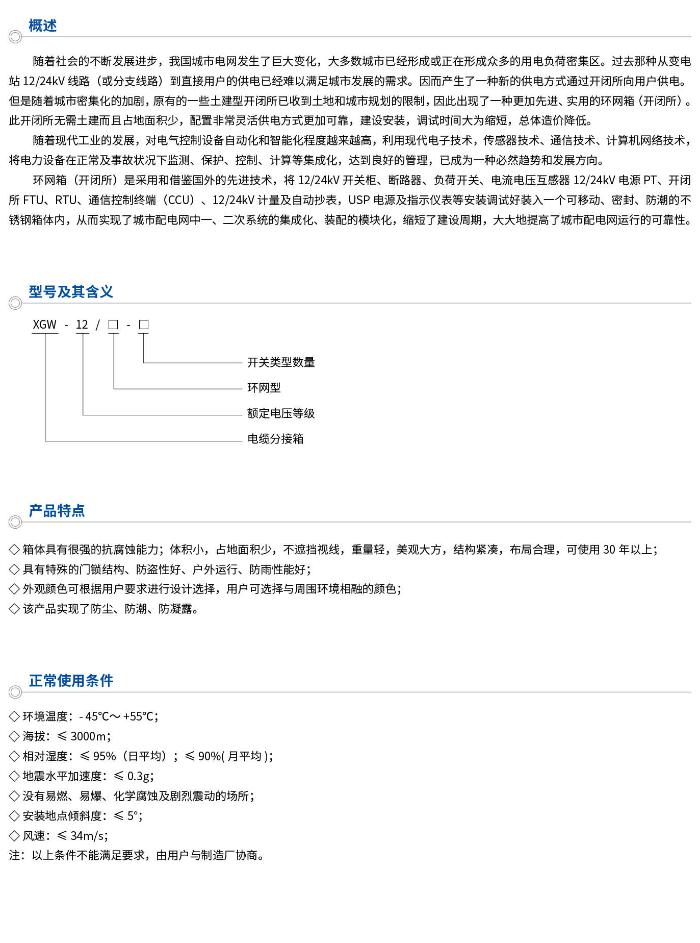 此开闭所无需土建而且占地面积少,配置非常灵活供电方式更加可靠,建设安装,调试时间大为缩短,总体造价降低。环网箱(开闭所)是采用和借鉴国外的先进技术,将12/24kV开关柜、断路器、负荷开关、电流电压互感器12/24kV电源PT、开闭所FTU、RTU、通信控制终端(CCU)、12/24kW计量及自动抄表,USP电源及指示仪表等安装调试好装入一个可移动、密封、防潮的不锈钢箱体内,从而实现了城市配电网中一、二次系统的集成化、装配的模块化,缩短了建设周期,大大地提高了城市配电网运行的可靠性。