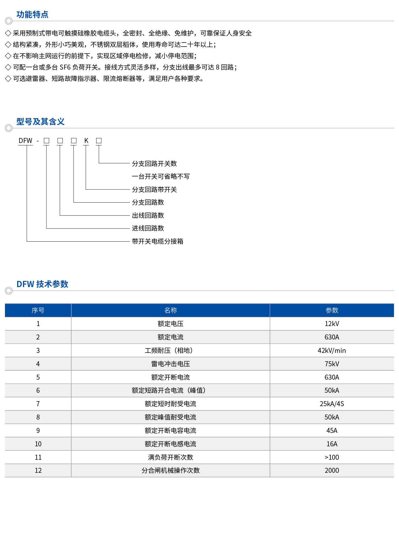 功能特点:采用预制式带电可触摸硅橡胶电缆头,全密封、全绝缘、免维护,可靠保证人身安全。结构紧凑,外形小巧美观,不锈钢双层稻体,使用寿命可达二十年以上;在不影响主网运行的前提下,实现区域停电检修,减小停电范围;可配一台或多台SF6负荷开关。接线方式灵活多样,分支出线可达8回路;可选避雷器、短路故障指示器、限流熔断器等,满足用户各种要求。
